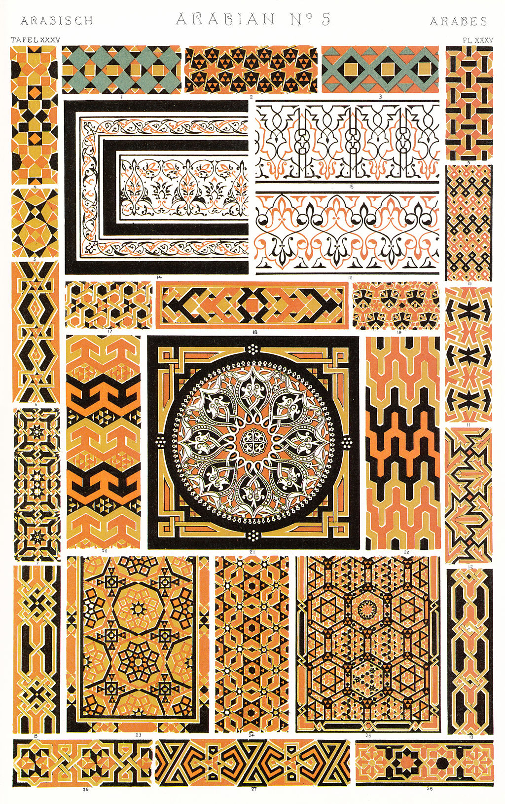 - ornements primitifs ou tribaux : le livre présente des exemples d'ornements issus de tribus sauvages, mettant en évidence des motifs géométriques et des lignes spirales inspirées de formes naturelles comme la corde torse. De nombreux exemples d'ornements tissés ou tressés figurent dans cette rubrique ;